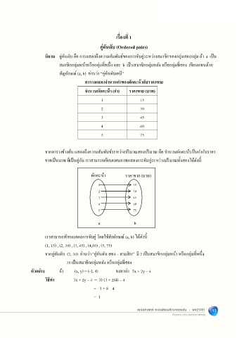 จากคู่อันดับ (�, ��) อ่านว่า “คู่อันดับ สอง – สามสิบ” มี � เป็นสมาชิกกลุ่มหน้า หรือกลุ่มที�หนึ�ง