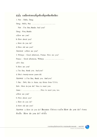 Answer :c. How do you do? Because ถ้าคําถาม ถามด้วย How do you do? คําตอบ