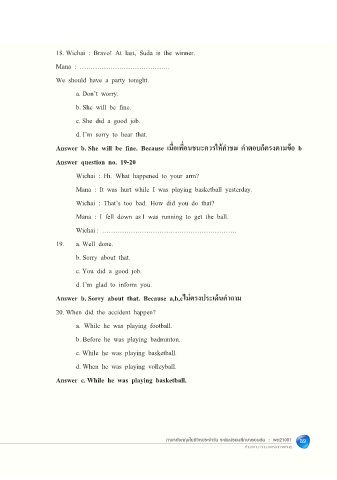 B : I’m afraid I’m not. I’m interested in playing badminton. Answer b. She will be fine. Because เมื่อเพื่อนชนะควรให้คําชม คําตอบก็ตรงตามข้อ b