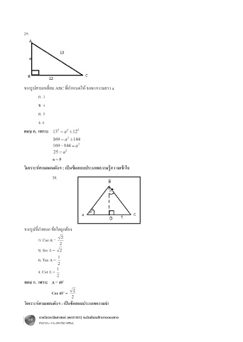 ตอบ ก. เพราะ A = 45˚ ก. Cos A = 2 2 วิเคราะห์ตามแผนผังฯ : เป็นข้อสอบประเภทความรู้ความเข้าใจ