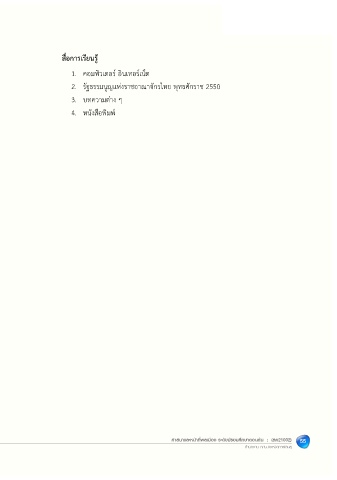 46 สื่อการเรียนรู 1. คอมพิวเตอร อินเทอรเน็ต 2. รัฐธรรมนูญแหงราชอาณาจักรไทย พุทธศักราช 2550 3. บทความตาง ๆ 4. หนังสือพิมพ ศาสนาและหน้าที่พลเมือง ระดับมัธยมศึกษาตอนต้น : (สค21002) 55 ส�ำนักงำน กศน.จังหวัดกำฬสินธุ์