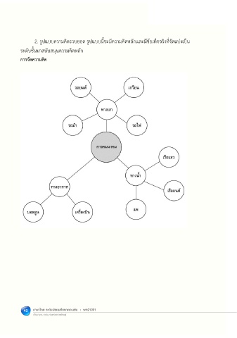 35 2. รูปแบบความคิดรวบยอด รูปแบบนี้จะมีความคิดหลักและมีขอเท็จจริงที่จัดแบงเปน ระดับชั้นมาสนับสนุนความคิดหลัก การจัดความคิด 42 ภาษาไทย ระดับมัธยมศึกษาตอนต้น : พท21001 ส�ำนักงำน กศน.จังหวัดกำฬสินธุ์