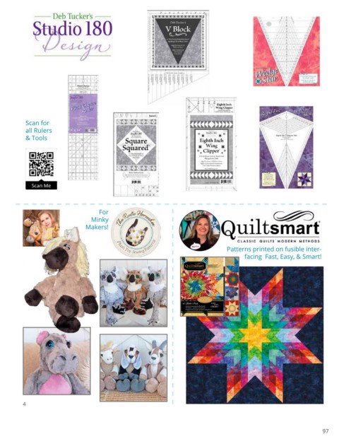 Scan for all Rulers & Tools For Minky Makers! Patterns printed on fusible inter- facing Fast, Easy, & Smart! PRINTED INTERFACING Fun additional photos & variations at quiltsmart.com 4 97