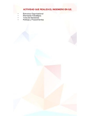ACTIVIDAD QUE REALIZA EL INGENIERO EN G.E. • Estructura Organizacional • Planeación Estratégica • Toma de Decisiones • Políticas y Procedimientos