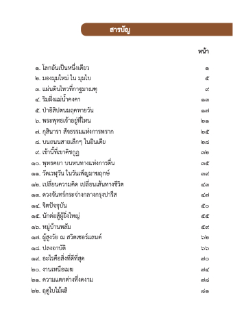 ๑๐. พุทธคยา บนหนทางแห่งการตื่น 35 ๑๑. วัดเวฬุวัน ในวันเพ็ญมาฆฤกษ์ 39 ๑๒. เปลี่ยนความคิด เปลี่ยนเส้นทางชีวิต 43 ๑๓. ดวงจันทร์กระจ่างกลางกรุงปารีส 47 ๑๔. จิตปัจจุบัน 50 ๑๕. นักต่อสู้ผู้ยิ่งใหญ่ 55 ๑๖. หมู่บ้านพลัม 59 ๑๗. ผู้สูงวัย ณ สวิตเซอร์แลนด์ 62 ๑๘. ปลงอาบัติ 66 ๑๙. อะไรคือสิ่งที่ดีที่สุด 70 ๒๐. งานเหนือเมฆ 74 ๒๑. ความแตกต่างที่งดงาม 78 ๒๒. ฤดูใบไม้ผลิ 81