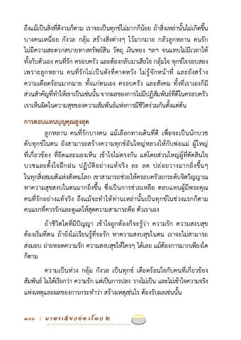 ถึงแม้เป็นส่ิงท่ีดีงามก็ตาม เราจะเป็นทุกข์ไม่มากก็น้อย ถ้าสิ่งเหล่าน้ันไม่เกิดข้ึน บางคนเหนื่อย กังวล กลุ้ม สร้างสิ่งต่างๆ ไว้มากมาย กลัวลูกหลาน คนรัก ไม่มีความสะดวกสบายทางทรัพย์สิน วัตถุ เงินทอง ฯลฯ จนแทบไม่มีเวลาให้ ทั้งกับตัวเอง คนที่รัก ครอบครัว และต้องกลับมาเสียใจ กลุ้มใจ ทุกข์ใจรอบสอง เพราะลูกหลาน คนที่รักไม่เป็นดังที่คาดหวัง ไม่รู้จักหน้าที่ และยังสร้าง ความเดือดร้อนมากมาย ทั้งแก่ตนเอง ครอบครัว และสังคม ท้ังที่เราเองก็มี สว่ นสาํ คญั ทที่ าํ ใหเ้ ขาเปน็ เชน่ นนั้ จากผลของการไมม่ ปี ฏสิ มั พนั ธท์ ด่ี ใี นครอบครวั เราเห็นผิดในความสุขของความสัมพันธ์แห่งการมีชีวิตร่วมกันต้ังแต่ต้น