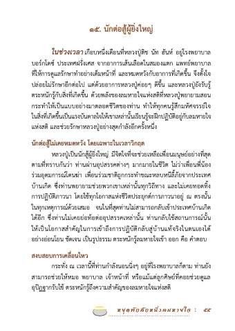 หลวงปู่เป็นนักสู้ผู้ยิ่งใหญ่ มีจิตใจที่จะช่วยเหลือเพ่ือนมนุษย์อย่างที่สุด ตามท่ีทราบกันว่า ท่านผ่านอุปสรรคต่างๆ มากมายในชีวิต ไม่ว่าเพื่อนพี่น้อง ร่วมอุดมการณ์โดนฆ่า เพ่ือนร่วมชาติถูกกระทําขณะหลบหนีล้ีภัยจากประเทศ บ้านเกิด ซ่ึงท่านพยายามช่วยพวกเขาเหล่าน้ันทุกวิถีทาง และไม่เคยทอดทิ้ง การปฏิบัติภาวนา โดยใช้ทุกโอกาสแห่งชีวิตประยุกต์การภาวนาอยู่ ณ ตรงน้ัน ในทุกเหตุการณ์ด้วยเสมอ จนในท่ีสุดท่านไม่สามารถกลับเข้าประเทศบ้านเกิด ได้อีก ซึ่งท่านไม่เคยย่อท้อต่ออุปสรรคเหล่านั้น ท่านกลับใช้สถานการณ์น้ัน ให้เป็นโอกาสสําคัญในการเข้าถึงการปฏิบัติกลับสู่บ้านแท้จริงในตนเองได้ อย่างอ่อนโยน ชัดเจน เป็นรูปธรรม ตระหนักรู้ลมหายใจเข้า ออก คือ คําตอบ
