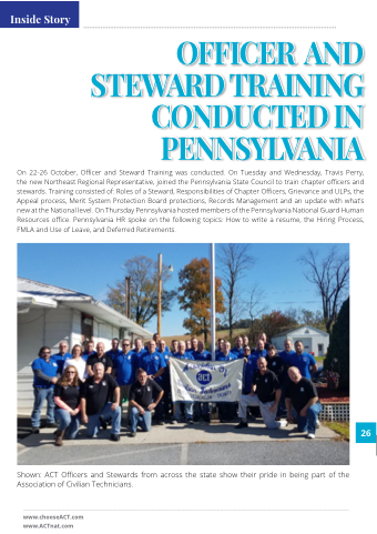 On On 22-26 October Officer and and Steward Training was conducted On On Tuesday and and Wednesday Travis Perry the the the new Northeast Regional Representative joined the the the Pennsylvania State Council to train chapter officers and stewards Training consisted of: Roles of of of a a a a a a a Steward Responsibilities of of of Chapter Officers Grievance and ULPs the Appeal process Merit System Protection Board protections Records Management and an an an update with what’s new at at at the the National National level On Thursday Pennsylvania Pennsylvania hosted members of the the Pennsylvania Pennsylvania National National Guard Human Resources office Pennsylvania HR spoke on the the following topics: How to to write a a a resume the the Hiring Process FMLA and and Use of Leave and and Deferred Retirements Shown: ACT Officers and Stewards from across the the the state show their pride in in being part of of the the the Association of Civilian Technicians www chooseACT com www ACTnat com 26