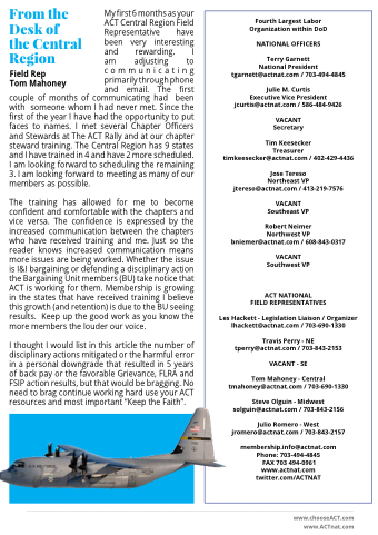 Field Representative have been very interesting and rewarding I am adjusting to communicating primarily through phone and email The first couple of of months of of communicating had had been with someone whom I I had had had never met Since the the the first of the the the year I I I have had had the the the opportunity to to put faces to to names I I met several Chapter Officers and and Stewards at at at The The ACT Rally and and at at at our chapter steward training The The Central Region