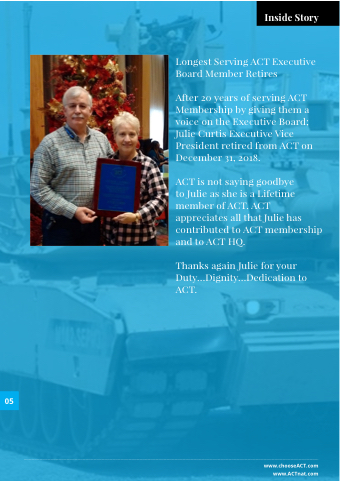 to Julie as she is a a Lifetime member of ACT ACT ACT ACT appreciates all that Julie has contributed to ACT membership and to ACT HQ Thanks again Julie for your Duty Dignity Dedication to ACT www chooseACT com www ACTnat com