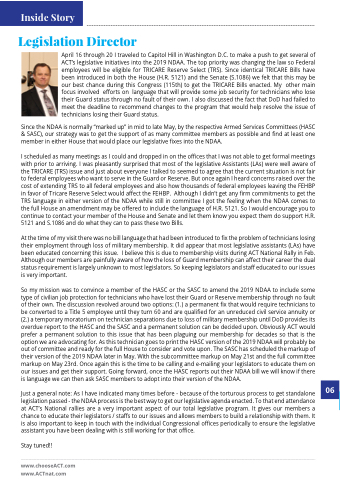 April 16 through 20 20 I traveled to to to to to to to Capitol Hill in in in in in Washington D D C C C to to to to to to to make a a a a a a a a a a a a push to to to to to to to get several of ACT’s legislative initiatives into the the 2019 NDAA The top priority was changing the the law so Federal employees will be be be eligible for TRICARE TRICARE Reserve Select (TRS) Since identical TRICARE TRICARE Bills have been introduced in in in in in both the the the the House (H R R R R R R R R R 5121) and the the the the Senate (S 1086) we felt that this this may be be be be our best chance during this this Congress (115th) to get the the the the TRICARE Bills enacted My other main focus involved efforts on on language that that will provide some job security ffor for technicians who lose their their Guard status through no fault of of their their own I also discussed the the the the the the fact that that that DoD had failed to to to meet the the the the the the the deadline to to to recommend changes to to to the the the the the the the program that that would help resolve the the the the the the the issue of of technicians losing their Guard status Since the the the NDAA is normally “marked up” in in fin mid to to late May by the the the respective Armed Services Committees (HASC & SASC) our our strategy was to to to get the the the the the support of as as as as many committee members as as as as possible and find at at at at at least one member member in in either House that would place our our legislative fixes into the the the NDAA I I I I scheduled as as as as as many meetings meetings as as as as as I I I I could and dropped in in in in on the the offices that that I I I I was was not able to to get formal meetings meetings with prior to to to to arriving I I I I I I was was pleasantly surprised that that that most o of of the the the the legislative Assistants (LAs) were well aware o of of the the the the the TRICARE (TRS) issue and just about everyone I I I I talked to to to to to seemed to to to to to agree that that the the the the the current situation is is is is is is not fair to to to to to federal federal federal employees employees employees who want to to to to to serve serve in in in in the the the the the Guard or Reserve But once once again I I I heard concerns raised over the the the the the cost of of of extending TRS to to to to all federal federal federal employees employees employees and and also how thousands of of of federal federal federal employees employees employees leaving the the the the the FEHBP FEHBP in in in in in in favor of of of of Tricare Reserve Select would affect the the the the the the the FEHBP FEHBP Although I I didn’t get get any firm commitments to to to get get the the the the the the the TRS language language in in in in in either version of of o of the the the the the the the the NDAA NDAA while still in in in in in committee I I I got the the the the the the the the feeling when the the the the the the the the NDAA NDAA comes to to to to the the the the the the the the the full House House an an an an an amendment may be be offered to to to to include the the the the the the the the the language language of o of of H H H H R R R 5121 So I I would encourage you you you to to to to continue to to to to contact your member o of of the the the the the the the House House and and and and Senate and and and and let them them know you you you expect them them do do support H H H H R R 5121 and and and and S S 1086 and and and and do what they can to to pass these two Bills At the the the the time of of of my visit there was no bill language that that had been introduced to fix the the the the problem of of of technicians losing their employment through loss of of of military membership membership It did appear that that most legislative assistants (LAs) have been educated concerning this this issue I I believe this this is is is is is is is due to membership membership membership visits during ACT National Rally in in in in Feb Although our our members members members are are are painfully aware of of how the the the loss of of Guard membership membership can affect their career the the the dual status requirement is is is is is largely unknown to to to to most legislators legislators So keeping legislators legislators and staff educated to to to to our our issues is very important So my mission was to to to convince a a a a a a a a member member of of the the the the HASC or or or the the the the SASC to to to amend the the the the 2019 NDAA to to to include some type of of of civilian job protection for technicians technicians who have lost their their Guard or or or Reserve membership through no fault of of their their own The discussion revolved around two options: (1 ) a a a a a a a a a a a a a a a a permanent fix that would require technicians technicians to to be be converted to to to to a a a a a a a a a a a a a a a a a a Title 5 employee until until they turn 60 and are qualified for an an an an an an unreduced civil service annuity or or or or or (2 ) a a a a a a a a a a a a a a a a a a temporary moratorium on on on on on technician separations due due to to to to loss of military membership until until DoD provides its overdue report to to to to the the the HASC and and the the the SASC and and a a a a a a a a a a a a a a a a a a a permanent permanent solution solution can be be be be decided upon Obviously ACT would prefer a a a a a a a a a a a a a a a a a permanent permanent solution solution to to to this this issue that that has been plaguing our membership for for decades so so so that that is is is is the the the the the option we are advocating for for for As this this technician goes to to to print the the the the the HASC version of of of the the the the the 2019 NDAA will probably be be be out of of of of committee committee committee and and and ready for for the the the the the the the the full full House to to c