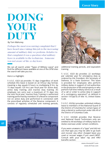 5 5 U S C 6323 (a) provides 15 days (regardless of work schedule this leave is is based on an an 8-hour day day day format meaning a a a a a a a a a a a a a a day day day equals equals 8 8 8 hours so multiplying 8 8 8 hrs hrs by 15 days equals equals 120 hrs hrs ) per fiscal year for active active active duty duty duty active active active duty duty duty training training and inactive duty duty duty training training An employee can carry over a a a a a a a a a a a a a a a maximum of 15 days into the next fiscal year Inactive Duty Training fis is authorized training performed performed by members of a a a a a a a a a Reserve component not on on on on on active duty and performed performed in in in connection with the the prescribed activities of of the the Reserve component It consists of of regularly scheduled unit training periods additional training training periods and equivalent training 5 U S C 6323 (b) provides 22 workdays per calendar year for emergency duty as ordered by the the President the the Secretary of Defense or or or or or a a a a State Governor This leave is is provided for for employees who perform military duties in in support of of civil authorities in in the protection of of life and property or or or or who perform full-time military service as a a a a a a a result of of a a a a a a a a a call or or or or order to active duty in in fin in support of of of a a a a a a a a contingency operation* as defined in in fin in section 101(a)(13) of of title 10 10 United States Code 5 U S C 6323(c) provides unlimited military leave to members of of of of the the National Guard of of of of the the District of of of of of Columbia for certain types of of of of of duty ordered or or or or authorized under title 49 of of of of the District of Columbia Code 5 U S C 6323(d) provides that Reserve and National Guard Technicians only are entitled to 44 workdays of military leave for duties overseas under certain conditions If you you were unaware of a a a a a a a a “type” and did not use that type type you you you may be able to go back and recover recover any other charged leave you you you used used or or recover recover wages if you you you used used LWOP Consult with your labor rep and HRO benefits section www chooseACT com www ACTnat com 057