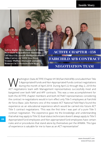 Left to Right: Steve Olguin (ACT Mid- West Field Rep) Jefferson Simmons (AF Vice/CS) Joseph Phillips(Steward) Mike Carver (ACTFFE Vice Pres) Yvonne Phillips (Steward) and Julio Romero (ACT Western Field Rep) W ACT negotiations team with Management representatives successfully meet and bargained over both NAF and APF contracts This was a a a a a a a new accomplishment for both both the ACTFFE chapter members and both both ACTNAT representatives considering the contract re-negotiations would in turn effect only Title 5 employees at at Fairchild Air force Base Julio Romero one of the the newest ACT National Field Rep’s found the the experience experience as an educational experience experience which would be carried into future ACT Title Title 5 5 contract negotiations “This was was the first time I was was part of a a a a a a pure Title Title 5 5 contract negotiation The experience gave me the knowledge and and understanding that what may apply apply to to Title Title 32 dual-status technicians doesn’t always apply apply to to Title Title 5 Appropriated fund fund employees employees and Non-appropriated fund fund employees employees have certain rules and and or procedures that stand alone by themselves per the the AFMAN This type of experience is valuable for me to have as an ACT representative” www chooseACT com www ACTnat com ACTFFE CHAPTER #138