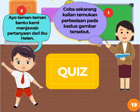 2 Coba sekarang 1 kalian temukan Ayo teman-teman bantu kami perbedaan pada menjawab kedua gambar pertanyaan dari Ibu tersebut. Helen. QUIZ 19