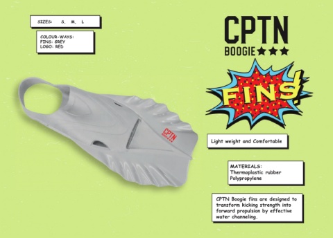 SIZES: S, M, L COLOUR-WAYS: FINS: GREY LOGO: RED Light weight and Comfortable MATERIALS: Thermoplastic rubber Polypropylene CPTN Boogie fins are designed to transform kicking strength into forward propulsion by effective water channeling.