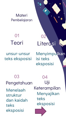 Materi Pembelajaran 01 02 Teori Literasi unsur-unsur Menyimpulkan teks eksposisi isi teks eksposisi 03 04 Pengetahuan Uji Keterampilan Menelaah struktur Menyajikan dan kaidah teks teks eksposisi eksposisi