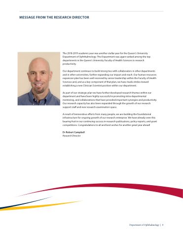 The 2018-2019 academic year was another stellar year for the Queen’s University Department of Ophthalmology. The Department was again ranked among the top departments in the Queen’s University Faculty of Health Sciences in research productivity.
