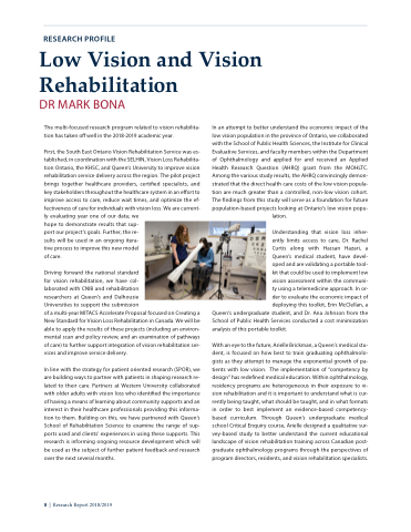 First, the South East Ontario Vision Rehabilitation Service was es- tablished, in coordination with the SELHIN, Vision Loss Rehabilita- tion Ontario, the KHSC, and Queen’s University to improve vision rehabilitation service delivery across the region. The pilot project brings together healthcare providers, certi ed specialists, and key stakeholders throughout the healthcare system in an e ort to improve access to care, reduce wait times, and optimize the ef- fectiveness of care for individuals with vision loss. We are current- ly evaluating year one of our data; we