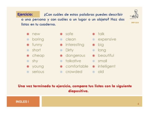 un interesting dangerous talkative comfortable crowded Una vez terminado tu ejercicio, compara tus listas con la siguiente diapositiva.