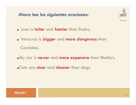 PPP 019 6 Sheila’s. than than oraciones: Pedro. than dangerous more more expensive p dogs. than siguientes funnier and and cleaner and las and taller bigger newer lee Veracruz is are nicer Ahora Juan is Cordoba. My car is My Cats INGLES I