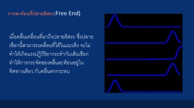กำรสะท้อนที่ปลำยอิสระ(Free End) เมื่อคลื่นเคลื่อนที่มาถึงปลายอิสระ ซึ่งปลาย เชือกนี้สามารถเคลื่อนที่ได้ในแนวดิ่ง จะไม่ ท าให้เกิดแรงปฏิกิริยากระท ากับเส้นเชือก ท าให้การกระจัดของคลื่นสะท้อนอยู่ใน ทิศทางเดียว กับคลื่นตกกระทบ