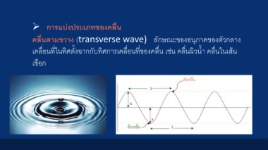 กำรแบ่งประเภทของคลื่น คลื่นตำมขวำง (transverse wave) ลักษณะของอนุภาคของตัวกลาง เคลื่อนที่ในทิศตั้งฉากกับทิศการเคลื่อนที่ของคลื่น เช่น คลื่นผิวน้ า คลื่นในเส้น เชือก