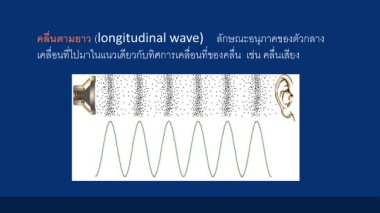 คลื่นตำมยำว (longitudinal wave) ลักษณะอนุภาคของตัวกลาง เคลื่อนที่ไปมาในแนวเดียวกับทิศการเคลื่อนที่ของคลื่น เช่น คลื่นเสียง