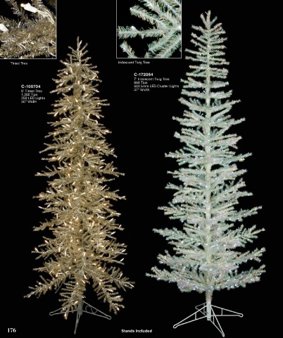 Tinsel Tree Iridescent Twig Tree C-172054 7’ Iridescent Twig Tree 866 Tips C-100704 500 5mm LED Cluster Lights 6’ Tinsel Tree 37” Width 1,360 Tips 250 LED Lights 30” Width 176 Stands Included