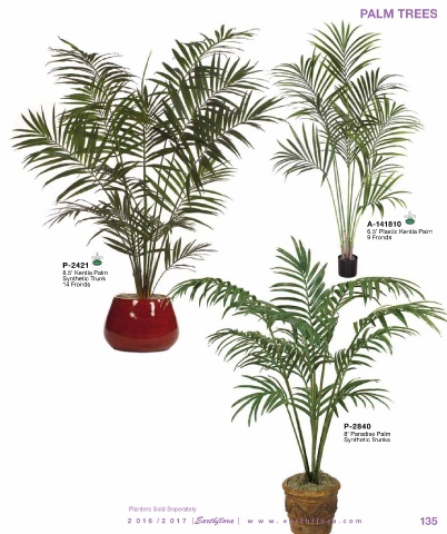 PALM TREES A-141810 6.5’ Plastic Kentia Palm 9 Fronds P-2421 8.5’ Kentia Palm Synthetic Trunk 14 Fronds P-2840 8’ Paradise Palm Synthetic Trunks Planters Sold Seperately l 2 0 1 6 / 2 0 1 7 Earthflora l w w w . e a r t h f l o r a . c o m 135