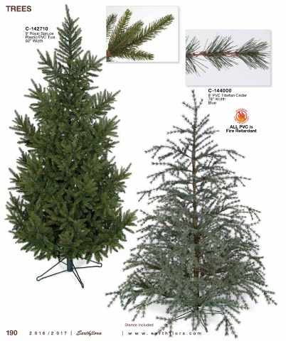 TREES C-142710 9’ Royal Spruce Plastic/PVC Tips 60” Width C-144000 8’ PVC Tibetan Cedar 78” Width Blue ALL PVC is Fire Retardant Stands Included 190 2 0 1 6 / 2 0 1 7 l Earthflora l w w w . e a r t h f l o r a . c o m