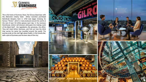 This is the home of Guinness Stout, the famous black beer with the distinctive creamy head. Arthur Guinness purchased Rainsfords Brewery here in 1759 and began brewing his famous "Porter", which is now produced around the world at the rate of over 10 million glasses each day. In the Guinness Storehouse, visitors will discover what goes into making a pint of the Black Stuff - the ingredients, the processes, the effort. They will meet Arthur Guinness, and find out how the drink that carries his name has travelled around the world. The journey ends on the roof high above Dublin, in the Gravity Bar, with a pint of Guinness and the best view of the city.