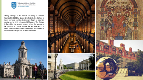 Trinity College is the oldest university in Ireland. Founded in 1592 by Queen Elizabeth 1, the College is in an enviable position in the very heart of Ireland's capital and in 1992 celebrated 400 years. The College is famed for the great treasures it has the honour to be guardian of. These include the BOOK OF KELLS, a ninth century illuminated manuscript, the books of Durrow and Armagh and an early Irish harp.