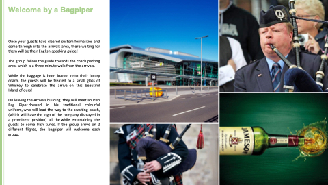 On leaving the Arrivals building, they will meet an Irish Bag Piper dressed in his traditional colourful uniform, who will lead the way to the awaiting coach, (which will have the logo of the company displayed in a prominent position) all the while entertaining the guests to some Irish tunes. If the group arrive on 2 different flights, the bagpiper will welcome each group.
