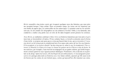 Récits rassemble cinq textes courts qui évoquent quelques unes des histoires que mon père