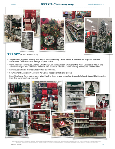 • Warm, Natural, Farmhouse, Crafted Christmas; Compelling, Fresh & Value for the Price; Decorative Pillows and Tabletop Designs and Selections were the best out of all retailers visited. Sewing Techniques and Details!!!