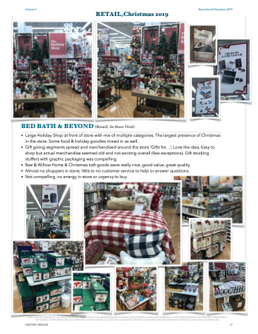 • Gift giving segments spread and merchandised around the store ‘Gifts for...’; Love the idea, Easy to shop but actual merchandise seemed old and not exciting overall (few exceptions). Gift stocking stuffers with graphic packaging was compelling.