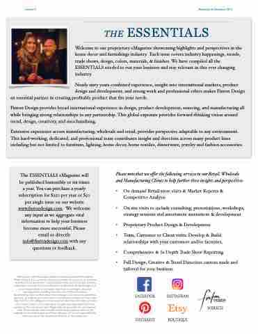 The ESSENTIALS eMagazine will be published bimonthly or six times a year. You can purchase a yearly subscription for $250 per year or $50 per single issue on our website www.fintondesign.com. We welcome any input as we aggregate vital information to help your business become more successful. Please email us directly info@fintondesign.com with any questions or feedback.