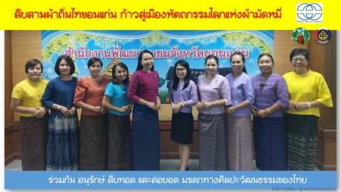 สืบสานผ้าถิ่นไทขอนแก่น ก้าวสู่เมืองหัตถกรรมโลกแห่งผ้ามัดหมี่ ร่วมกัน อนุรักษ์ สืบทอด และต่อยอด มรดกทางศิลปะวัฒนธรรมของไทย ส ำนักงำนพัฒนำชุมชนจังหวัดขอนแก่น