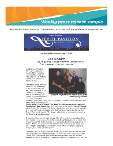 Mentioned as Season Sponsor in 17 press releases, April 29 through July 8 and Aug. 12 through Sept. 30.