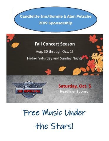 Fall Concert Season Aug. 30 through Oct. 13 Friday, Saturday and Sunday Nights Saturday, Oct. 5 Headliner Sponsor Free Music Under the Stars!