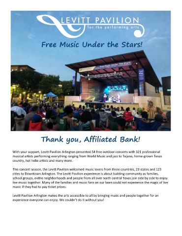 cities to Downtown Arlington. The Levitt Pavilion experience is about building community as families,