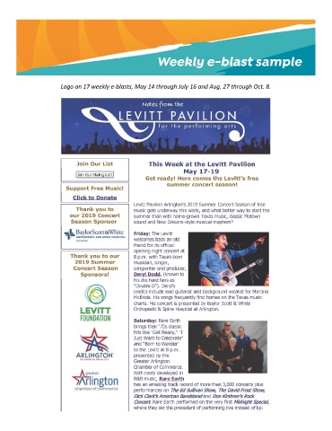 Logo on 17 weekly e-blasts, May 14 through July 16 and Aug. 27 through Oct. 8.