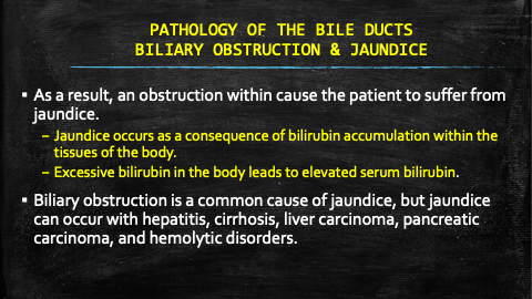 ▪ Biliary obstruction is a common cause of jaundice, but jaundice can occur with hepatitis, cirrhosis, liver carcinoma, pancreatic carcinoma, and hemolytic disorders.