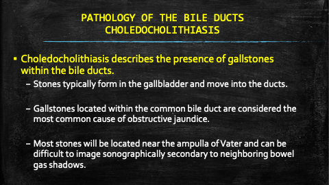 ▪ Choledocholithiasis describes the presence of gallstones within the bile ducts.