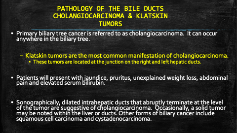 – Klatskin tumors are the most common manifestation of cholangiocarcinoma. ▪ These tumors are located at the junction on the right and left hepatic ducts.