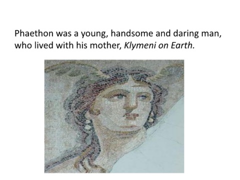 Phaethon was a young, handsome and daring man, who lived with his mother, Klymeni on Earth.
