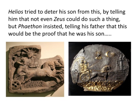 Helios tried to deter his son from this, by telling him that not even Zeus could do such a thing, but Phaethon insisted, telling his father that this would be the proof that he was his son…..