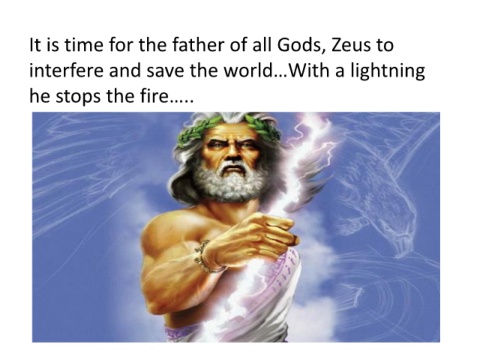 It is time for the father of all Gods, Zeus to interfere and save the world…With a lightning he stops the fire…..