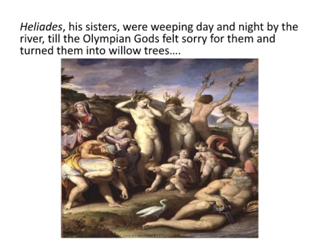Heliades, his sisters, were weeping day and night by the river, till the Olympian Gods felt sorry for them and turned them into willow trees….