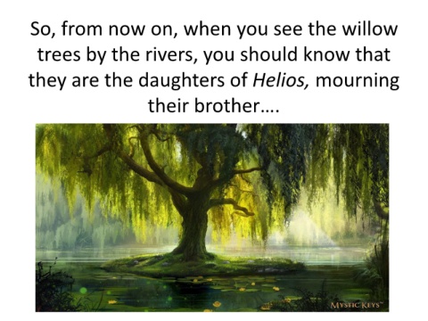 So, from now on, when you see the willow trees by the rivers, you should know that they are the daughters of Helios, mourning their brother….